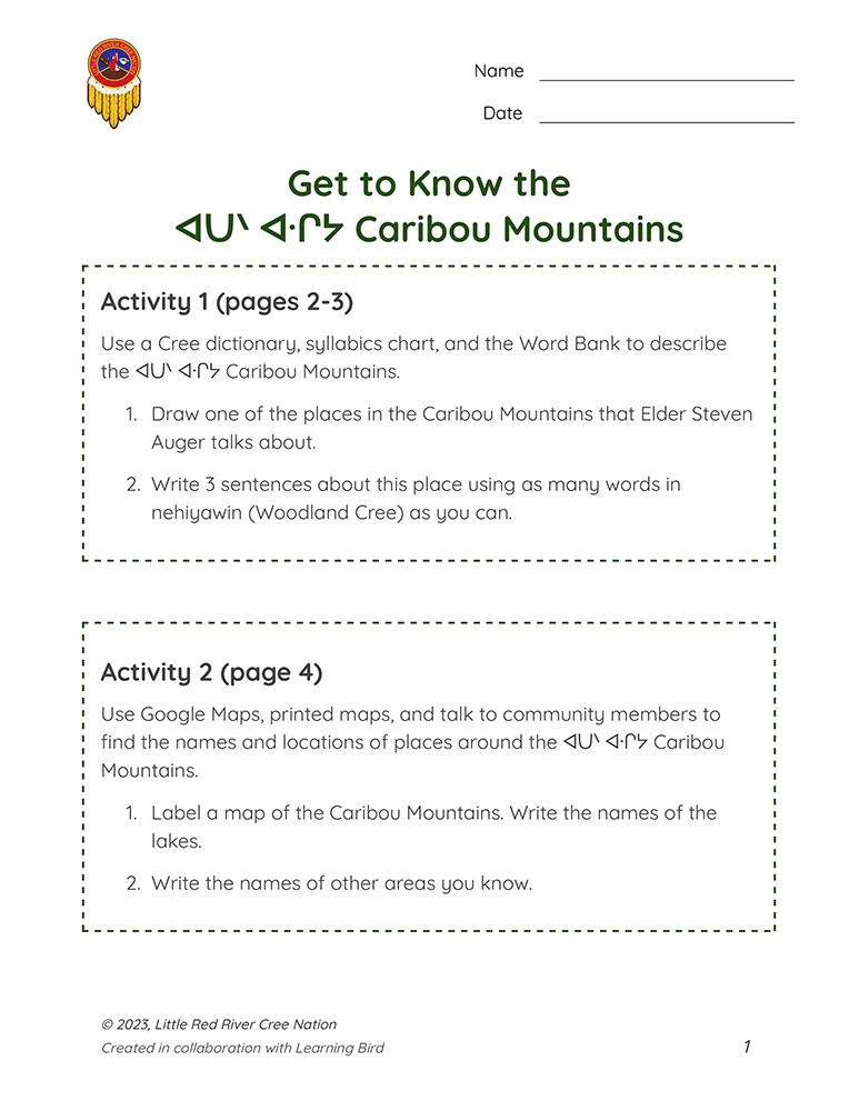 In this handout, learners describe the ᐊᑌᐠ ᐊᐧᒋᔭ Caribou Mountains and find the names and locations of places around the area.