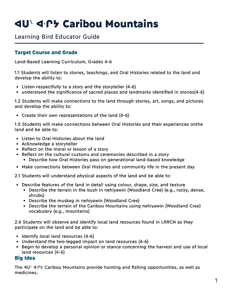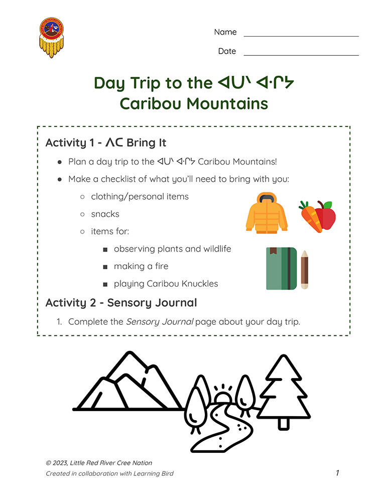 In this handout, learners plan a day trip to the ᐊᑌᐠ ᐊᐧᒋᔭ Caribou Mountains and use their senses to reflect on what they experienced.