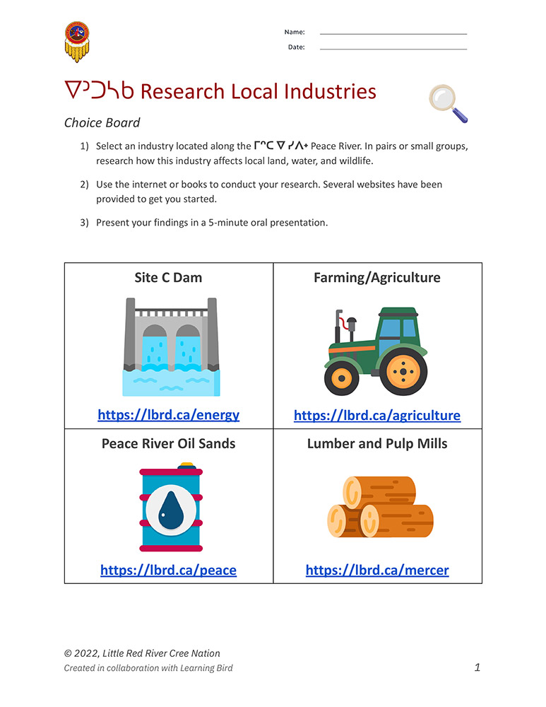 Many industries affect the land, water, and wildlife. In this handout, research local hydroelectric, farming, oil, and lumber industries to learn how they affect our community and traditional practices.