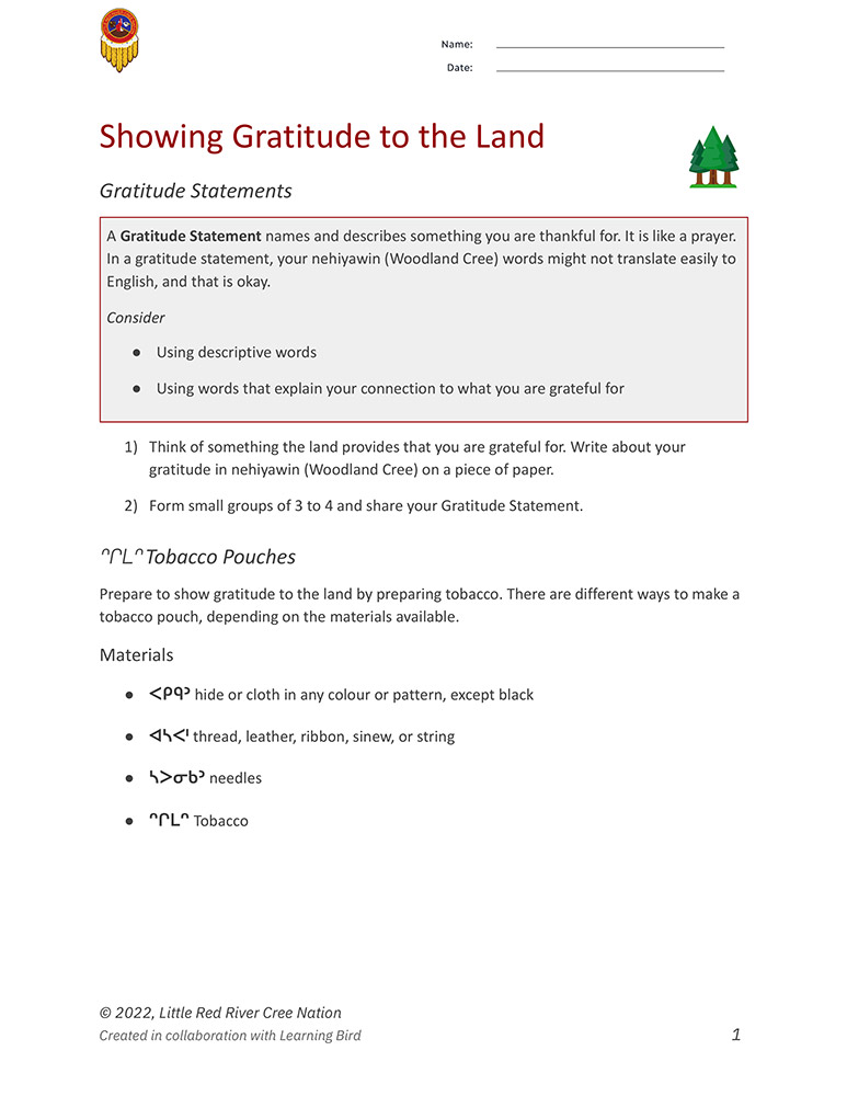 What does the land provide for us? In this handout, follow the activities to write a Gratitude Statement, prepare a tobacco pouch, and then take a walk to offer the words of gratitude and tobacco.