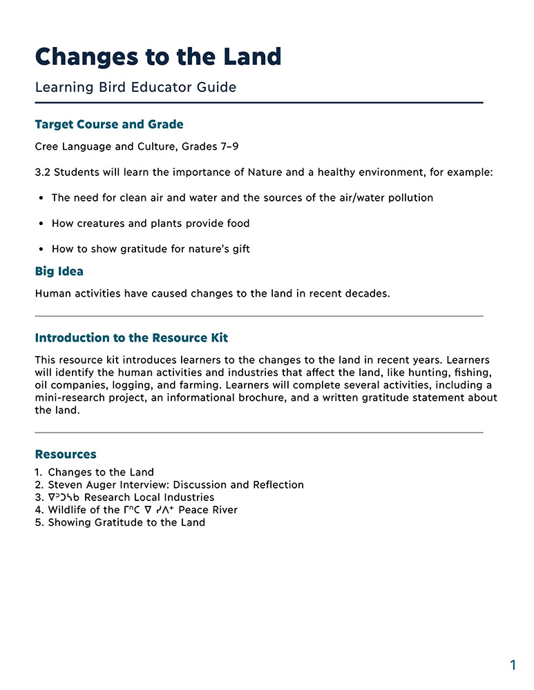 These resources explore human activities and industries that have impacted the land and water around Little Red River. Elder Steven Auger talks about changes he has observed in wildlife along the Peace River over his lifetime. Then, learners do mini-research projects on local industries, including the Site C Dam, logging, farming, and oil.