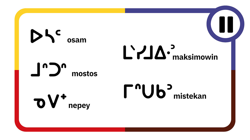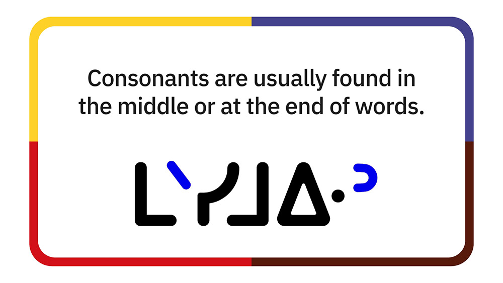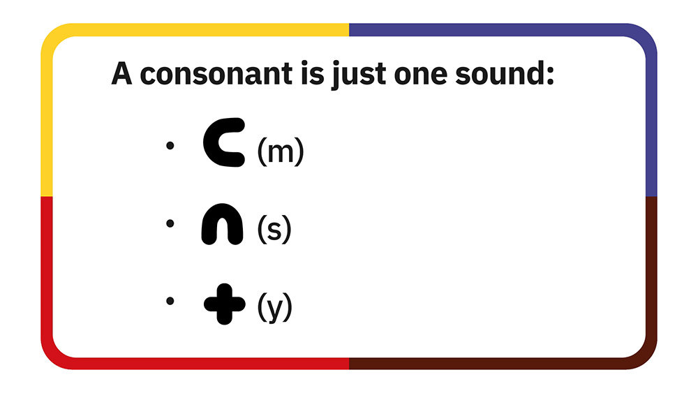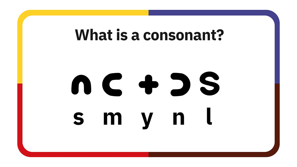 See pictures from a video that introduces learners to the ᑊ ᐟ ᐠ ᐨ ᐦ consonants. Learners hear, print, read, and pronounce each of these five consonants.
