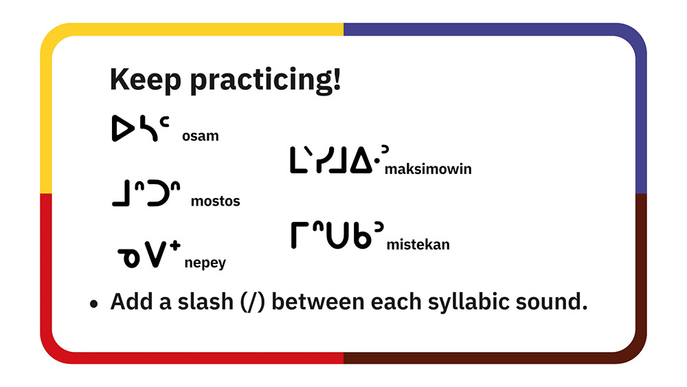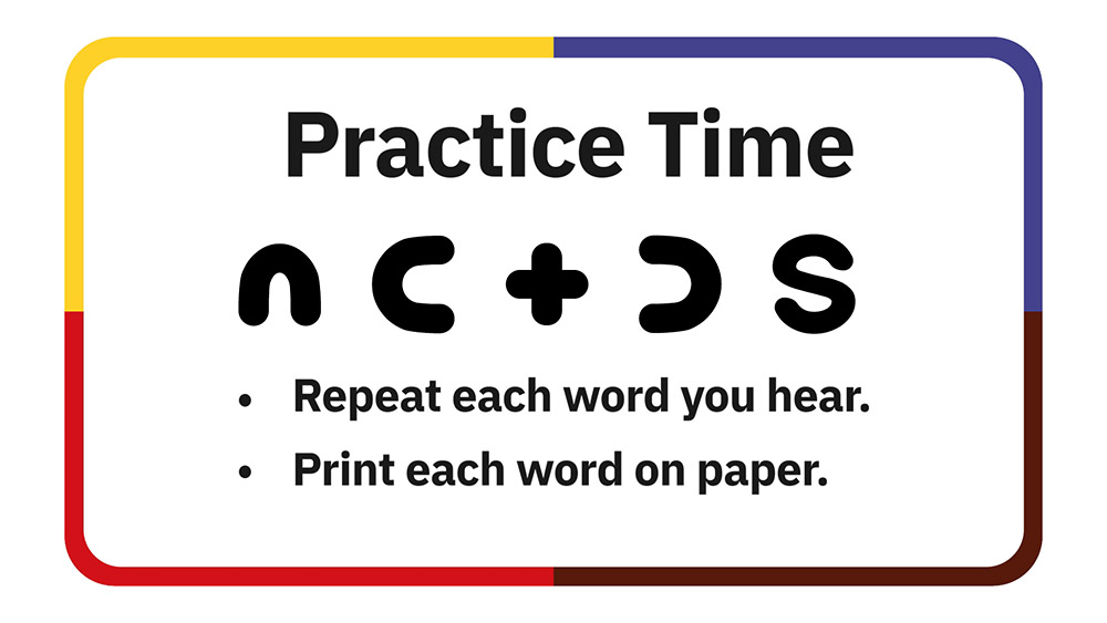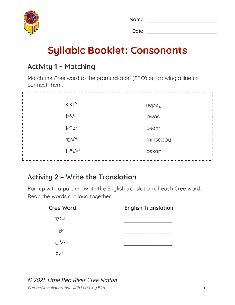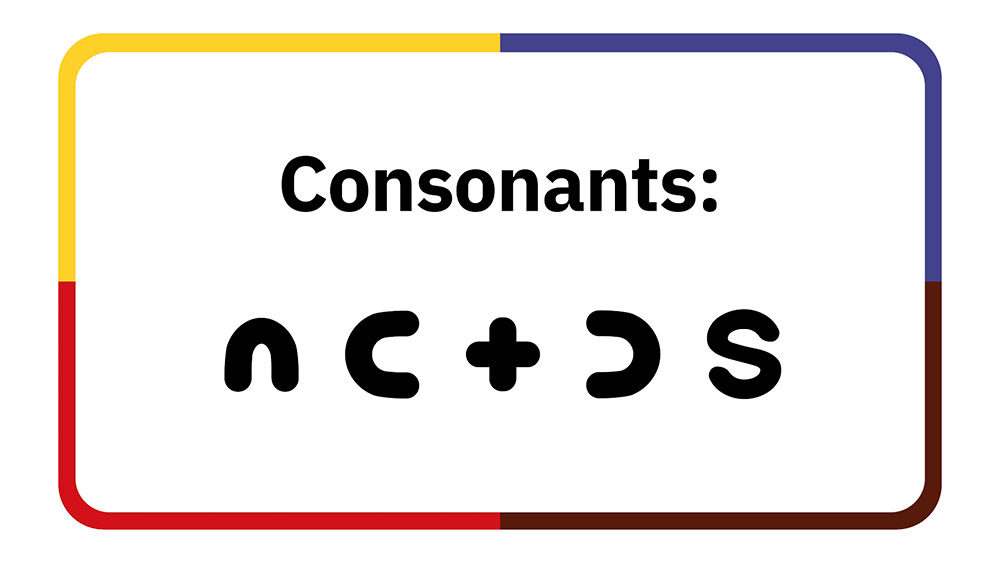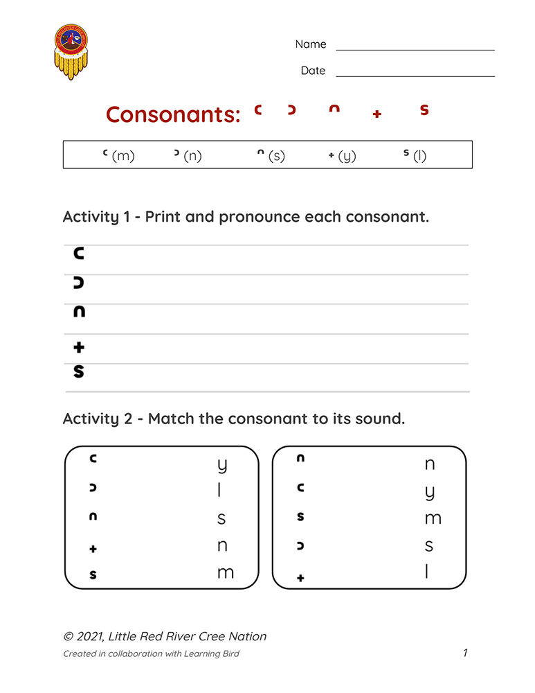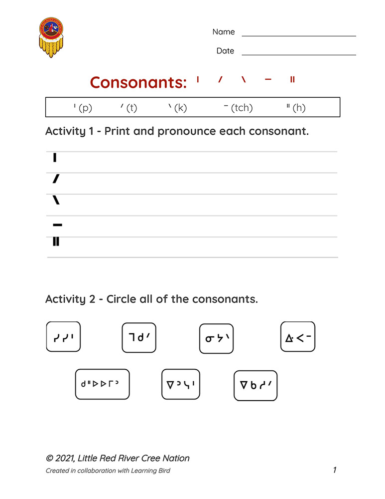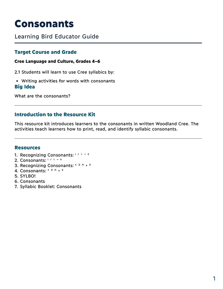 In these resources, learners practice reading, writing, and pronouncing the consonants in the Woodland Cree syllabic alphabet.
