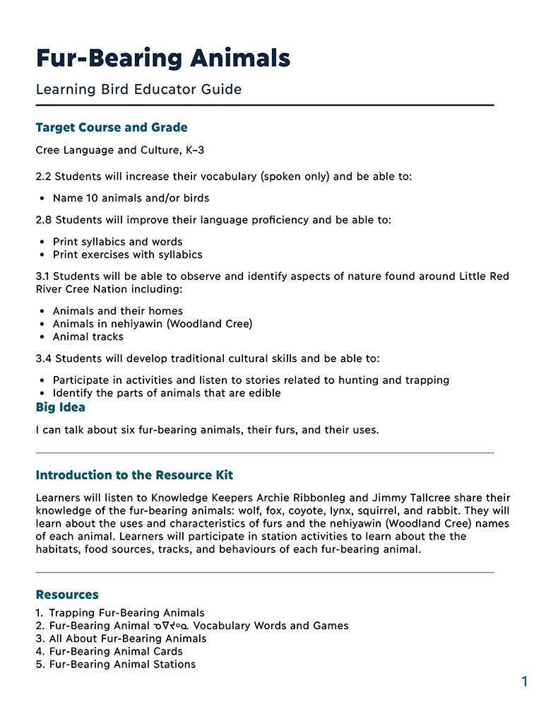 In these resources, learners listen as Knowledge Keepers Archie Ribbonleg and Jimmy Tallcree share their knowledge of fur-bearing animals. Then, learners name and identify fur-bearing animals in Woodland Cree, their habitat, food sources, tracks, and behaviours.