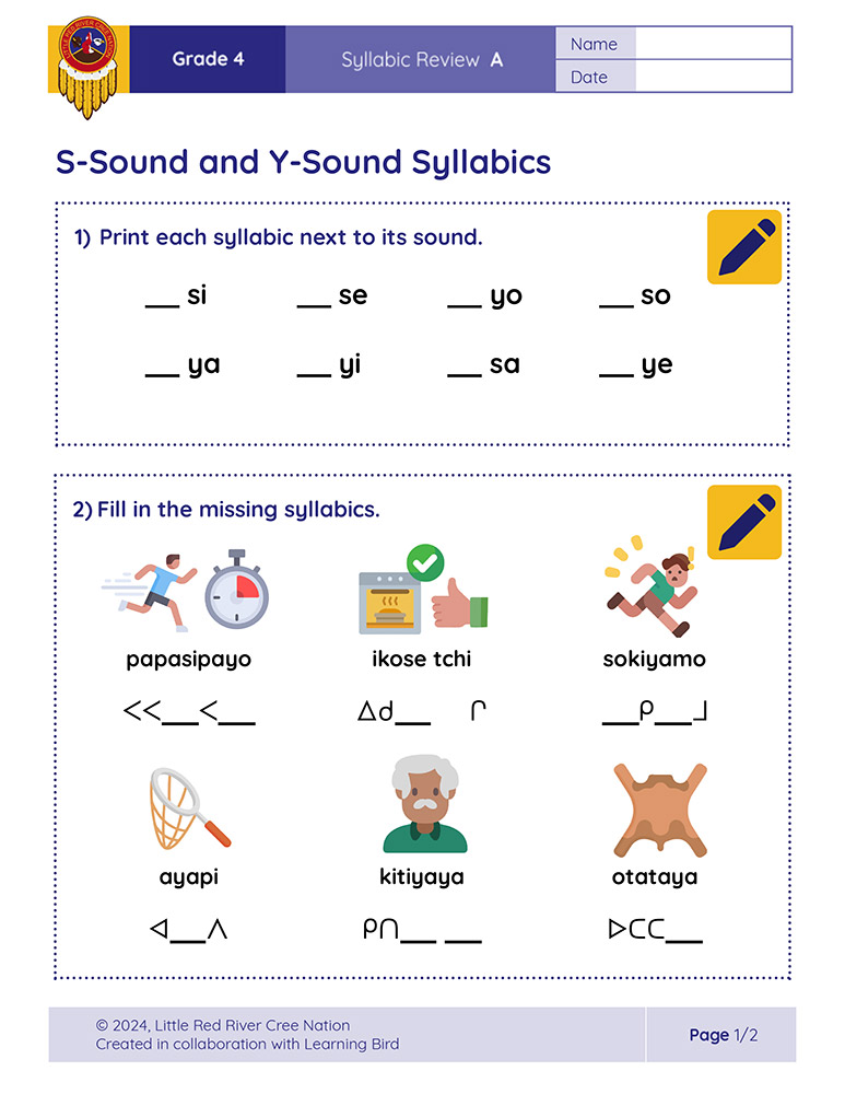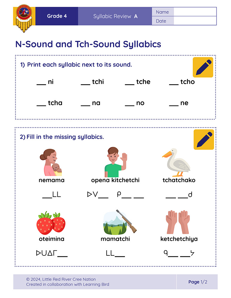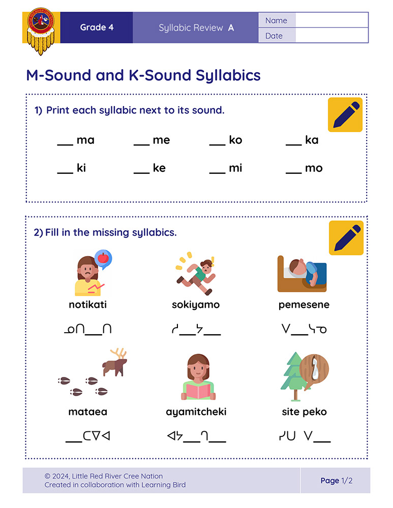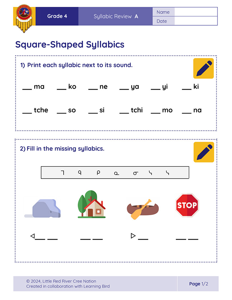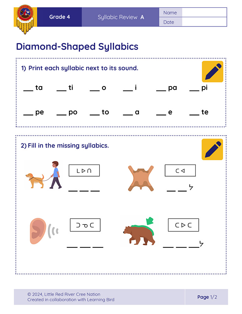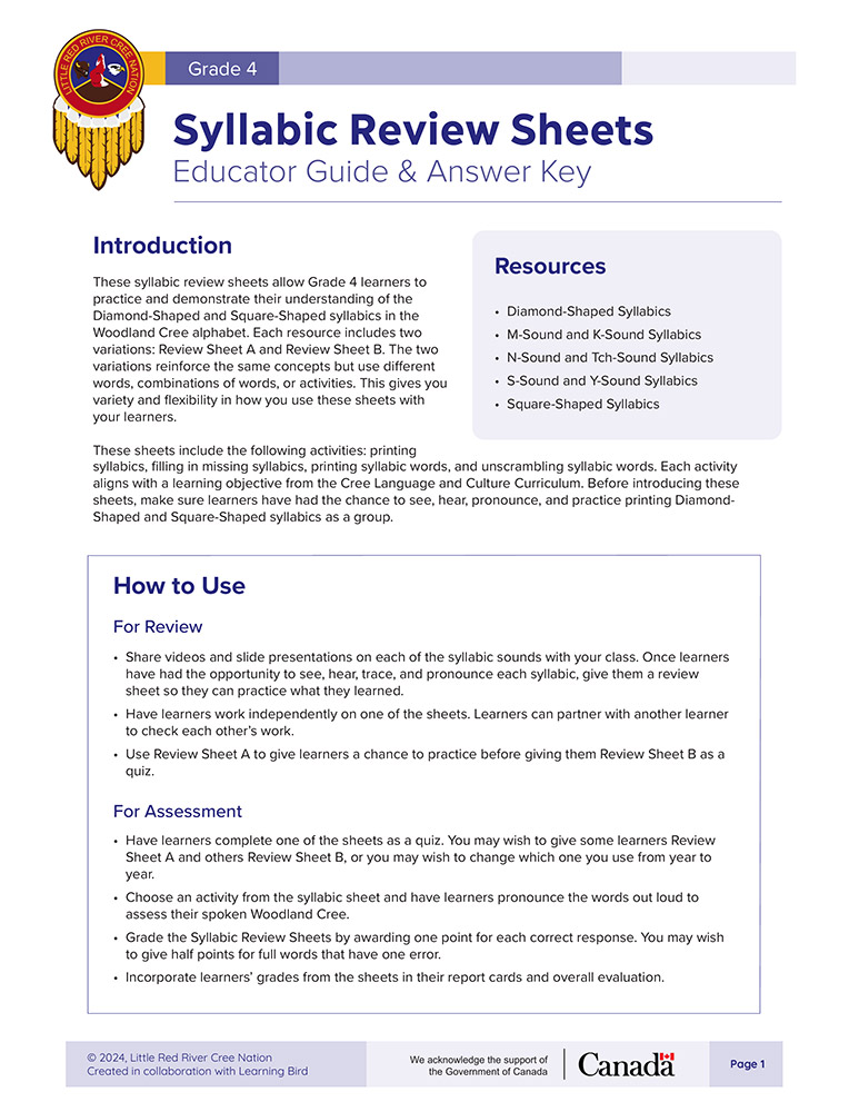These syllabic review sheets allow Grade 4 learners to practice and demonstrate their understanding of reading and writing Diamond-Shaped and Square-Shaped syllabics in the Woodland Cree alphabet. The following sheets are included: Diamond-Shaped Syllabics, M-Sound and K-Sound Syllabics, N-Sound and Tch-Sound Syllabics, S-Sound and Y-Sound Syllabics, and Square-Shaped Syllabics.
