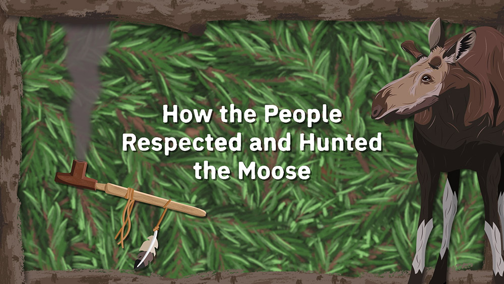 The Traditional Story “How the People Respected and Hunted the Moose” is shared with learners through animation. In this story, a young bull moose helps learners understand that hunters who show respect to the moose are the ones who are successful when they hunt.