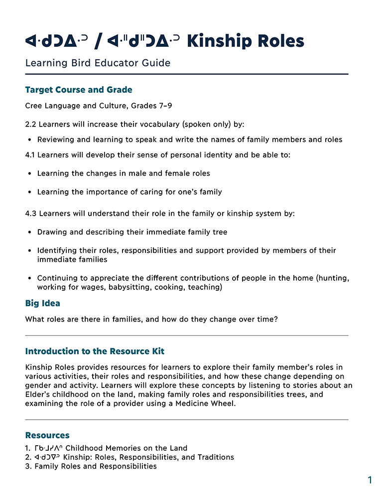 In these resources, learners learn about kinship roles by listening to Elder Steven Auger share stories about his childhood on the land. Then, they identify family roles and responsibilities, and acknowledge the role of providers in their families.