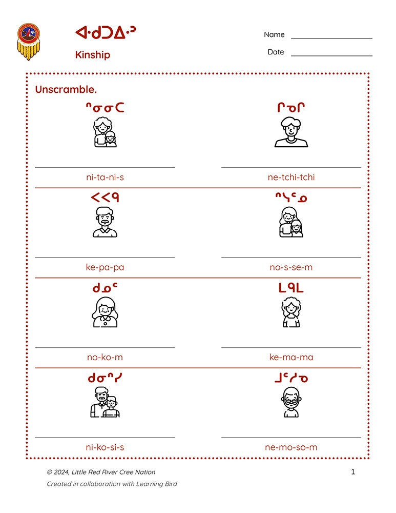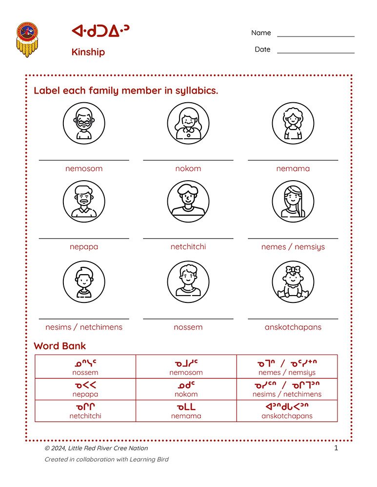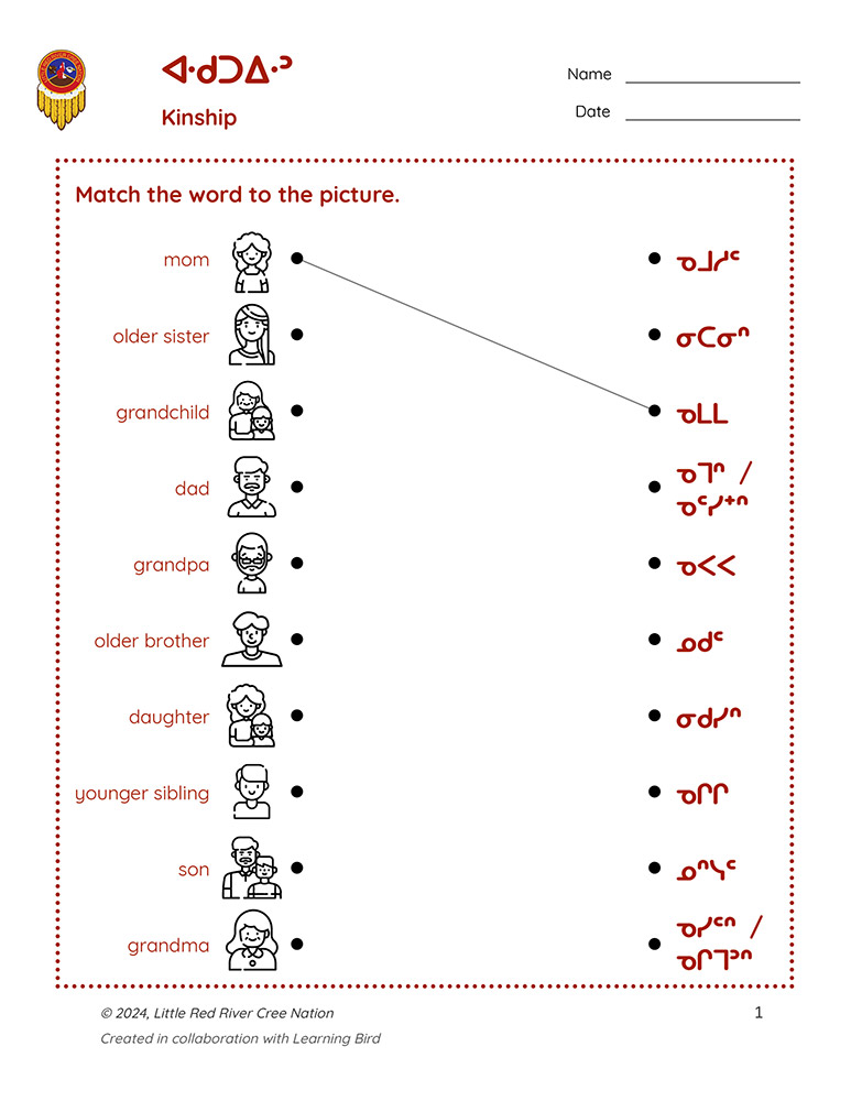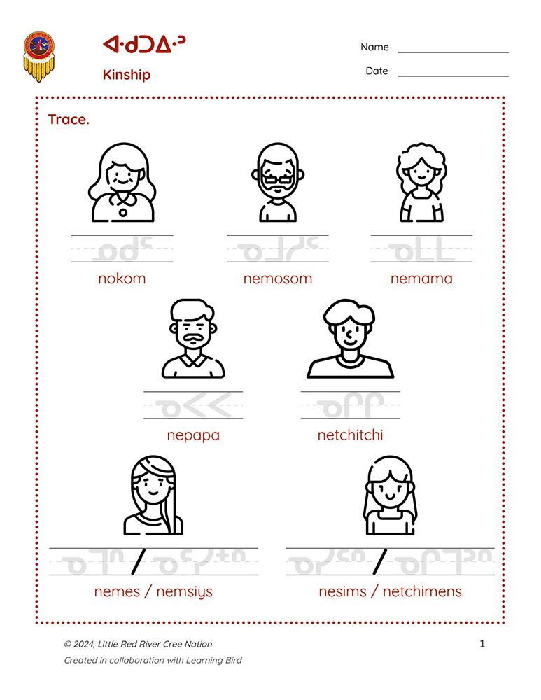In this worksheet, Grades 4–6 learners practice reading and writing kinship vocabulary in Woodland Cree.
