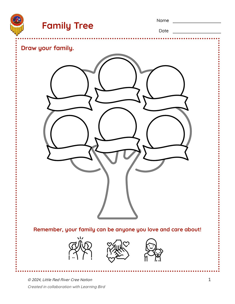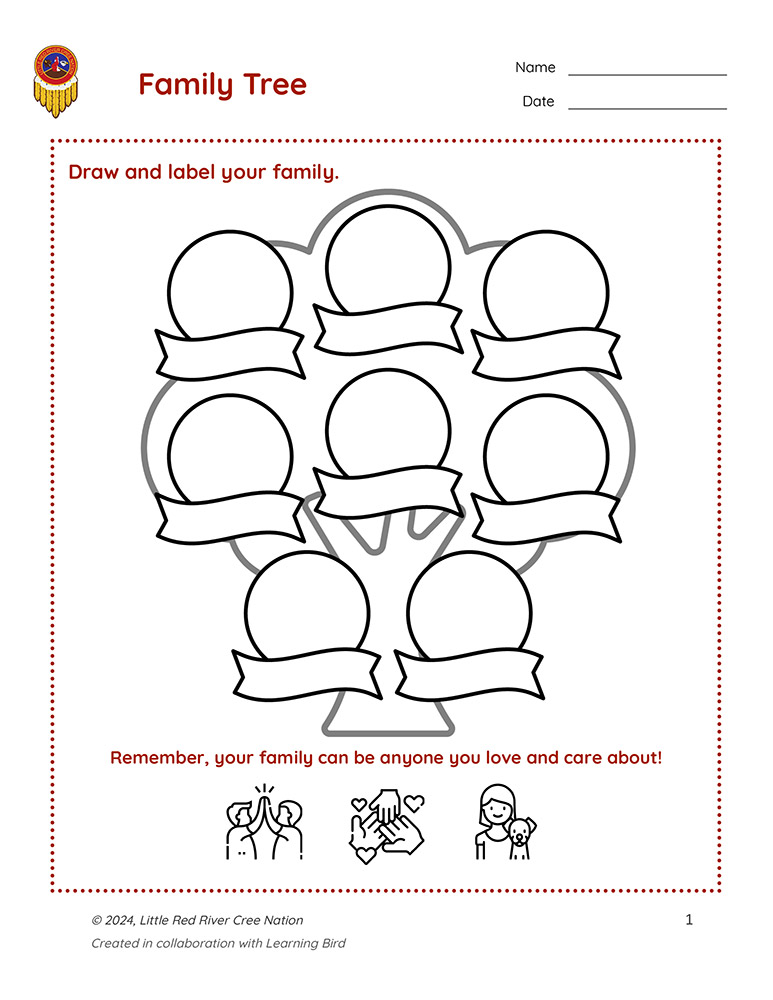 In this worksheet, Grades 4–6 learners practice reading and writing kinship vocabulary in Woodland Cree by drawing and labelling their family tree. They also reflect on a family member who is important to them.