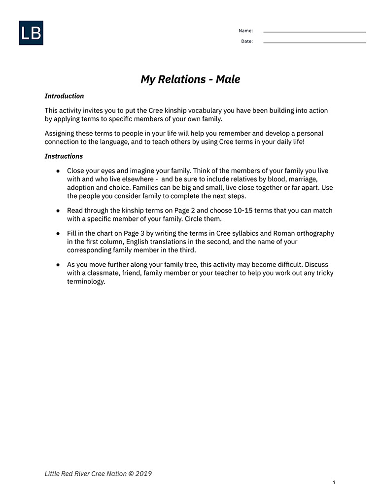 This handout helps students use Woodland Cree vocabulary to name the relations on their family tree.