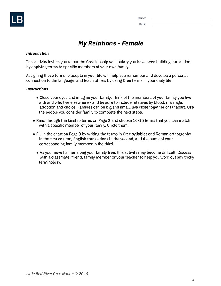 This handout asks students to use Woodland Cree vocabulary to name the relations on their family tree.