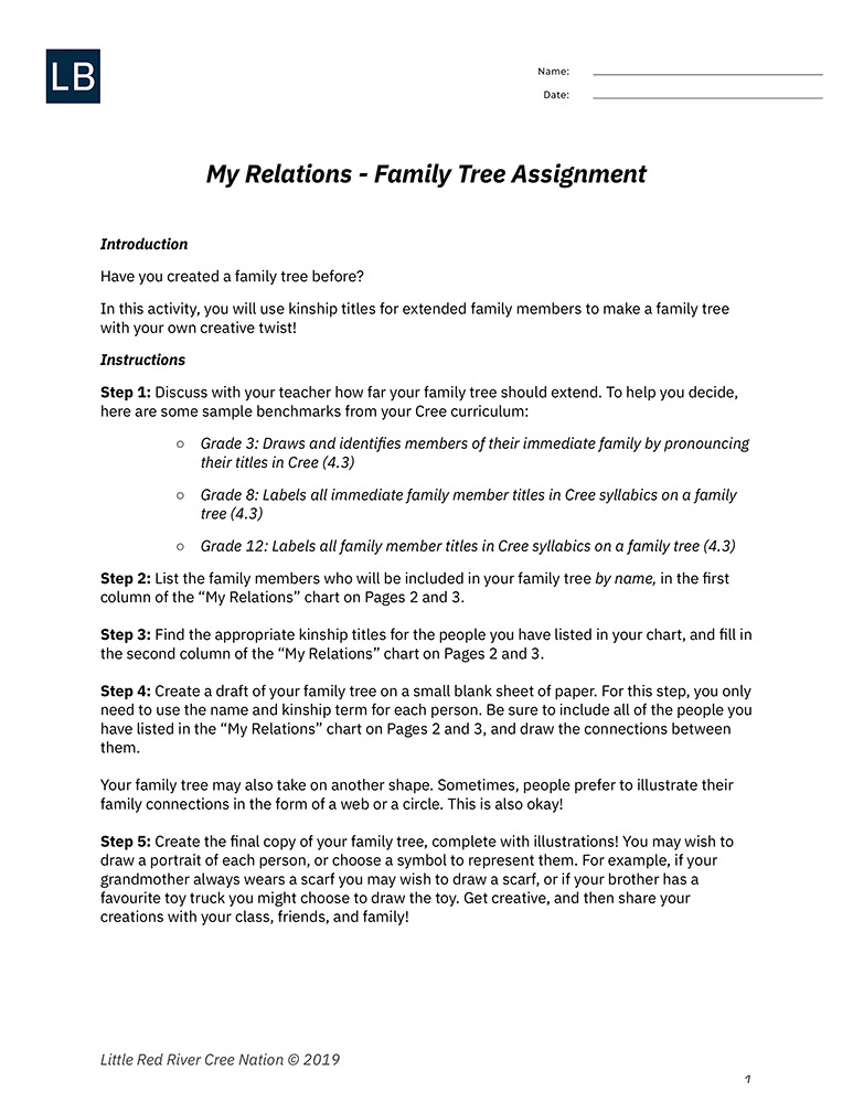 This handout explains a family tree assignment. Students create a family tree using the Woodland Cree vocabulary for family relations.