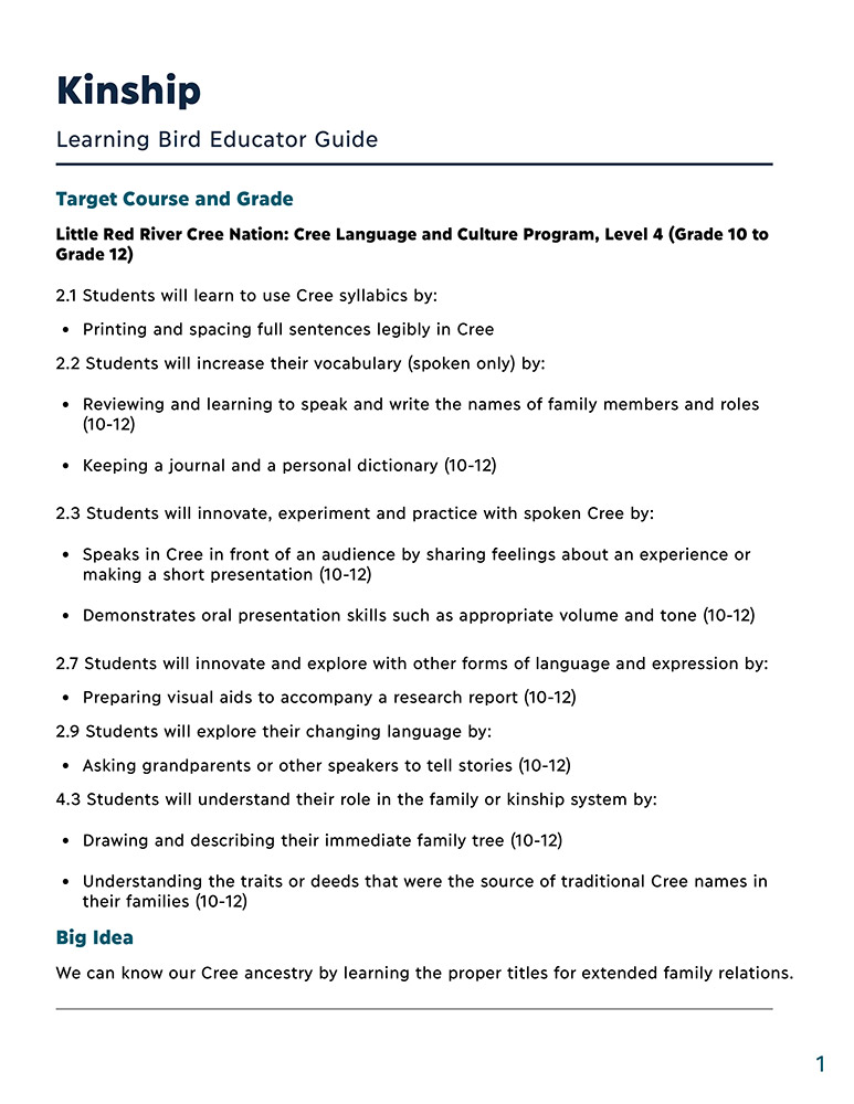 These resources introduce Woodland Cree kinship titles for extended family members. Students listen to the pronunciation of kinship titles in vocabulary videos. Then they practice writing kinship vocabulary in activities that lead to creating and presenting a three-generation family tree.