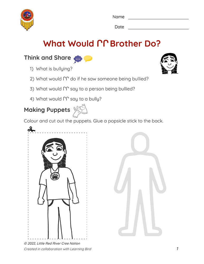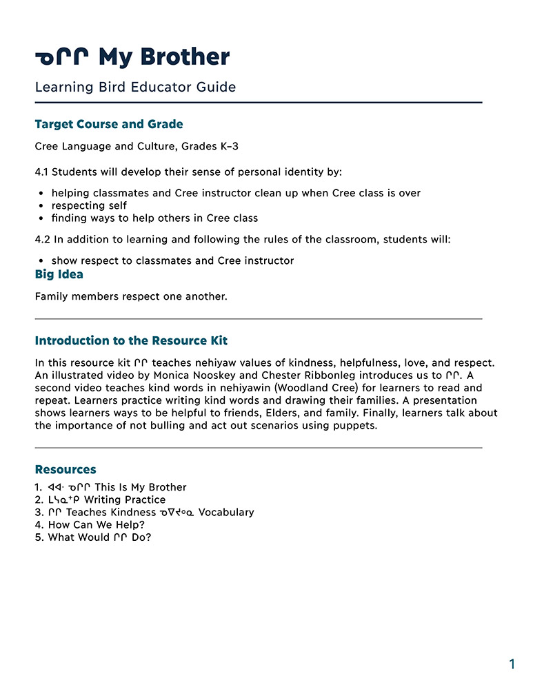 These resources share lessons about nehiyaw values of kindness, helpfulness, and respect. A story written by Monica Nooskey and illustrated by Chester Ribbonleg introduces students to the character ᒋᒋ (Brother). ᒋᒋ teaches students words and phrases in Woodland Cree about being helpful to others and not bullying.