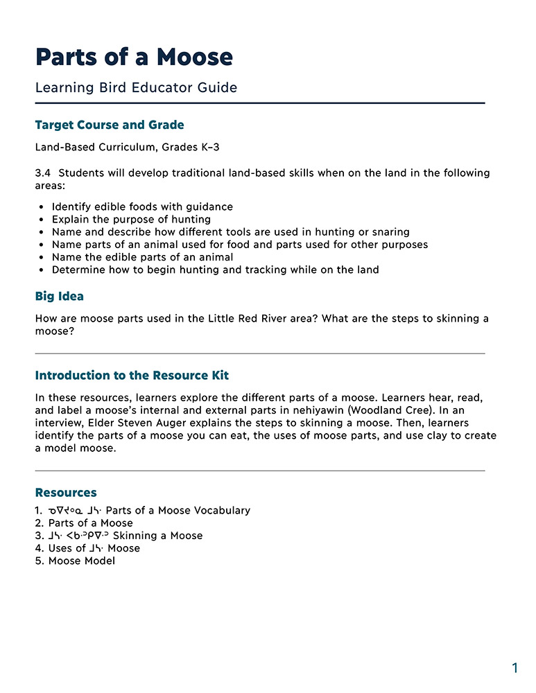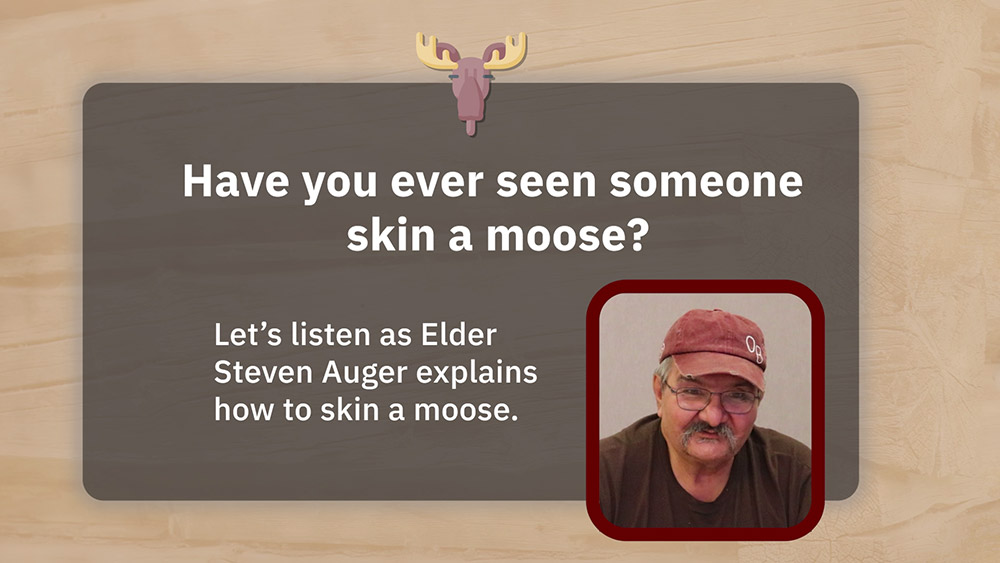 In these resources, learners name the different parts of a moose in Woodland Cree. They identify the uses of moose parts, watch an interview with Elder Steven Auger about skinning a moose, and review the parts of a moose you can eat.