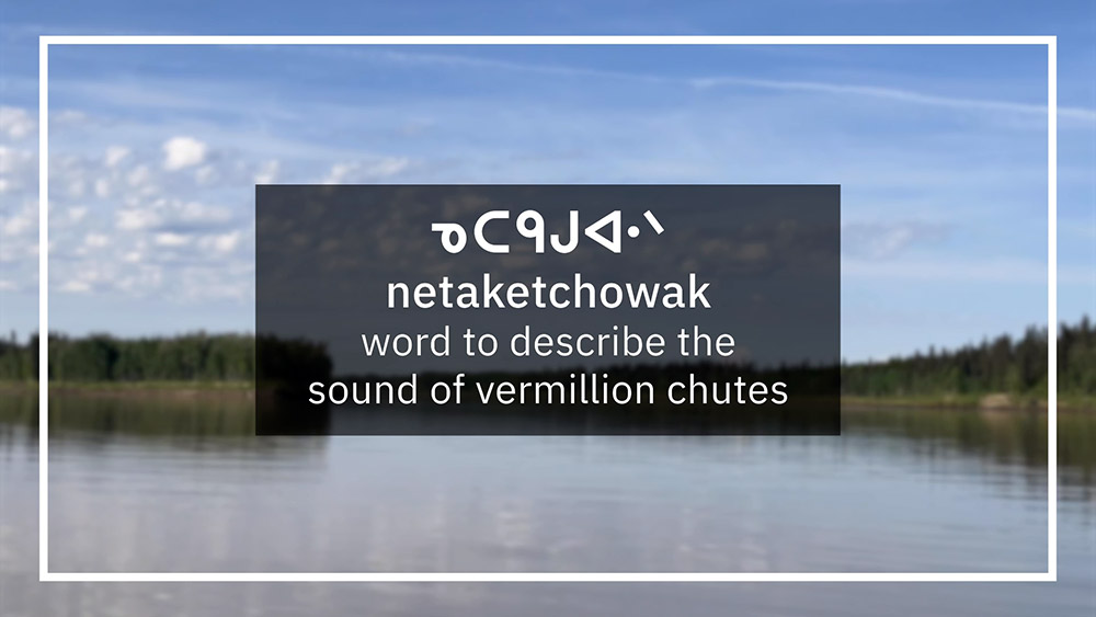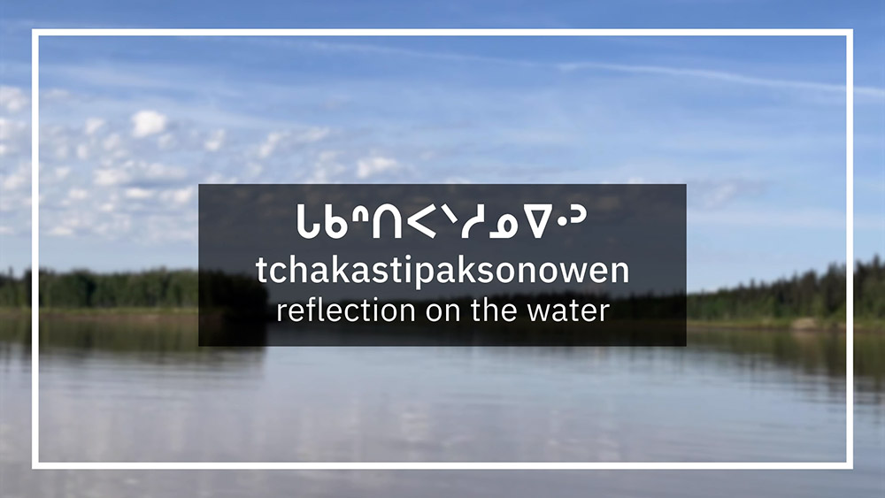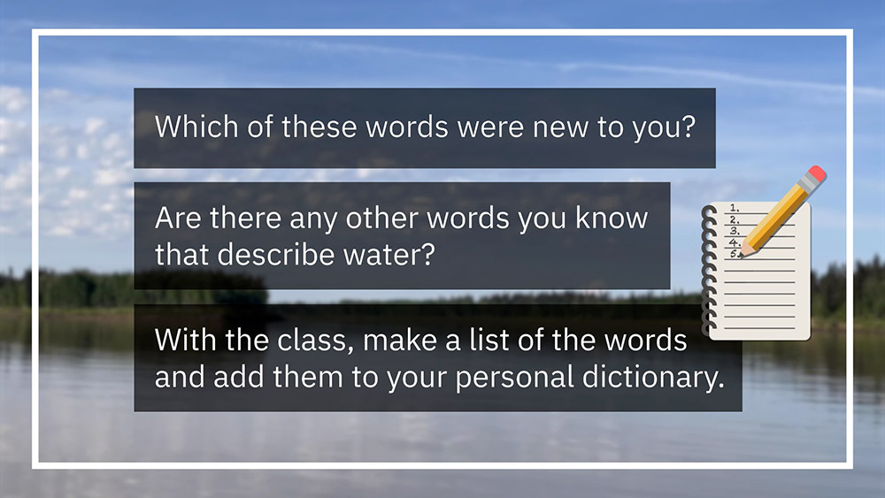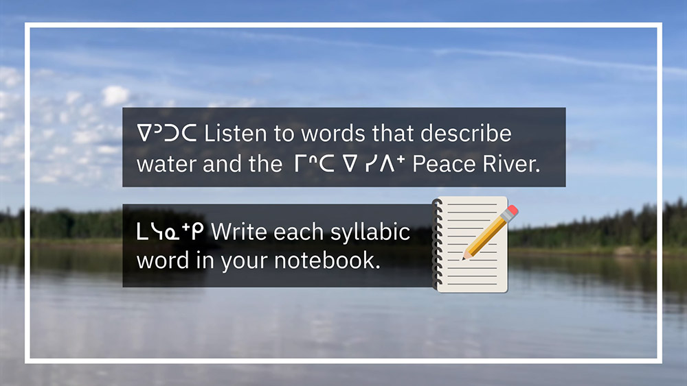 See pictures from a video where learners listen to and write words that describe water and the ᒥᐢᑕ ᐁ ᓯᐱᐩ Peace River.