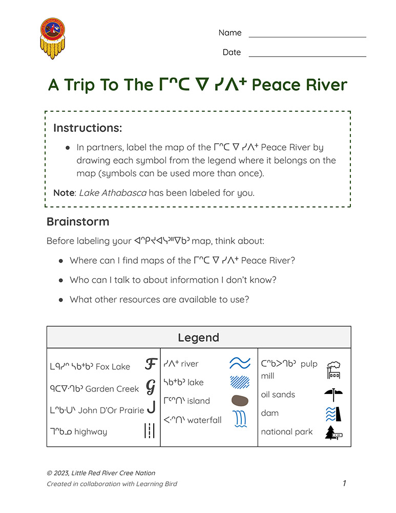 In this handout, learners label a map of the ᒥᐢᑕ ᐁ ᓯᐱᐩ Peace River and plan a visit.