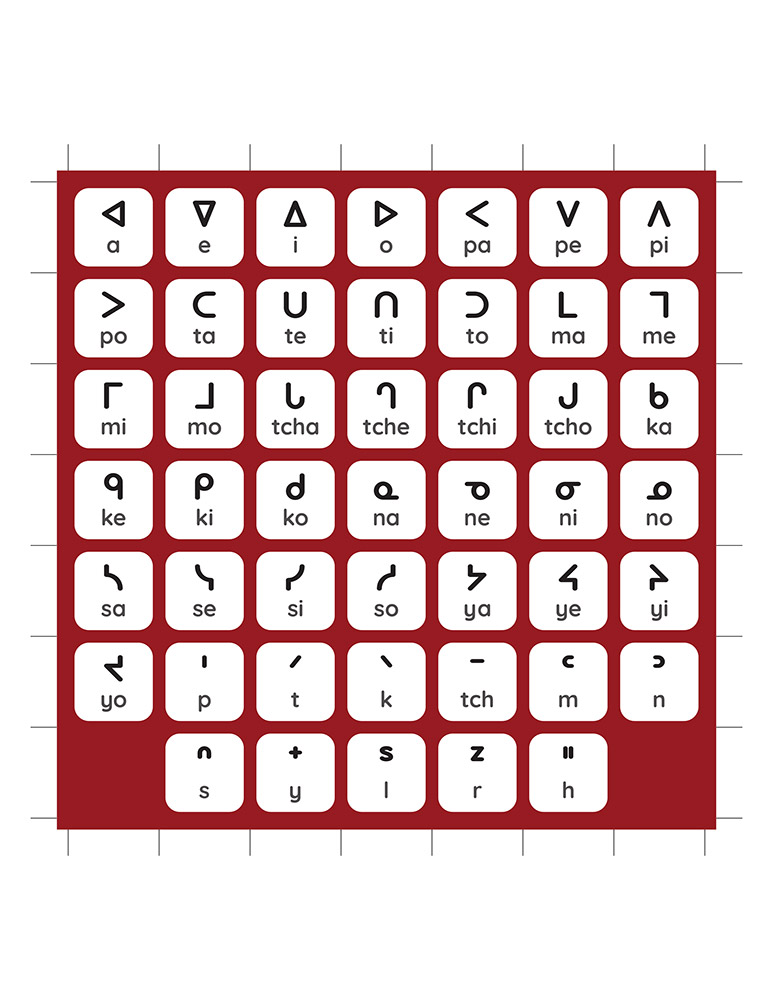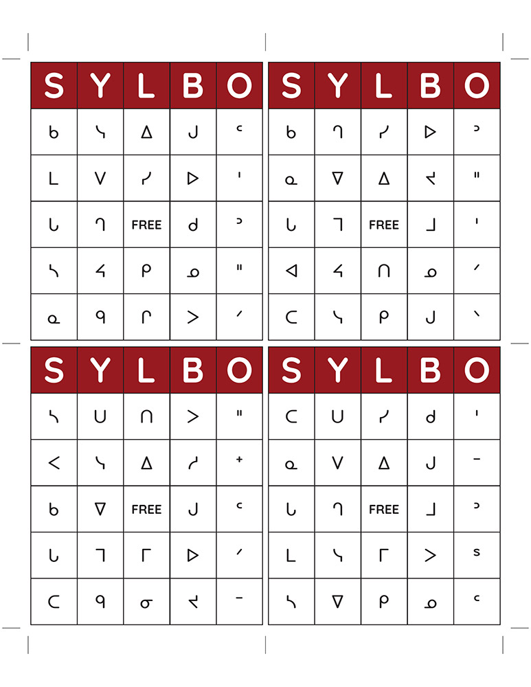 SYLBO is a classroom language game similar to BINGO that helps learners practice Woodland Cree syllabics. Each Woodland Cree language teacher has a printed, laminated game set complete with tokens and tiles for the caller.