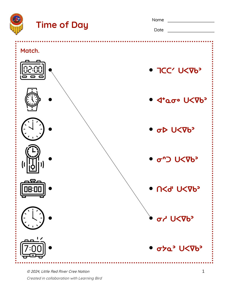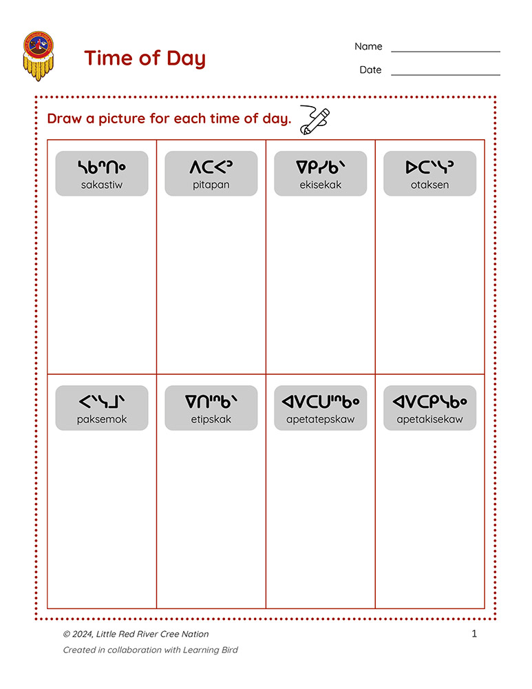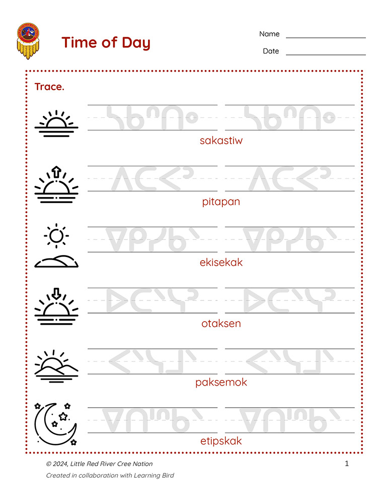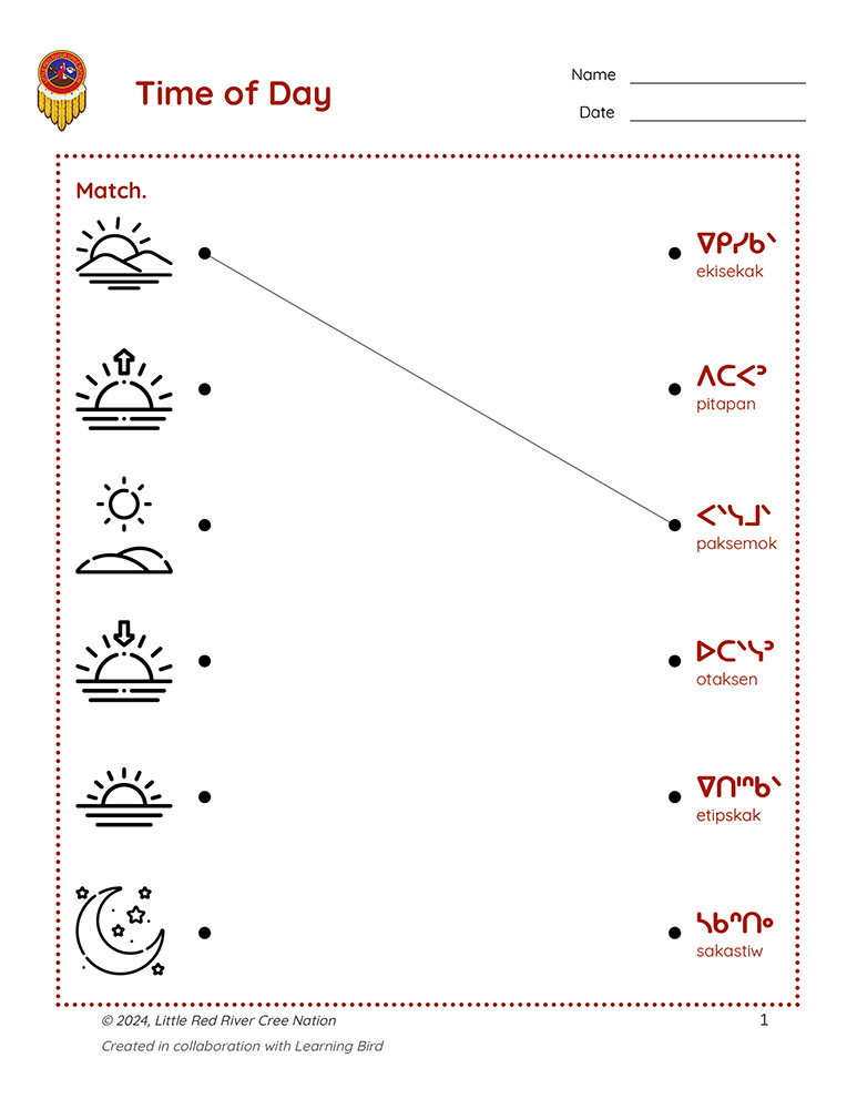 In this worksheet, Grade 2 learners practice Woodland Cree time of day vocabulary.