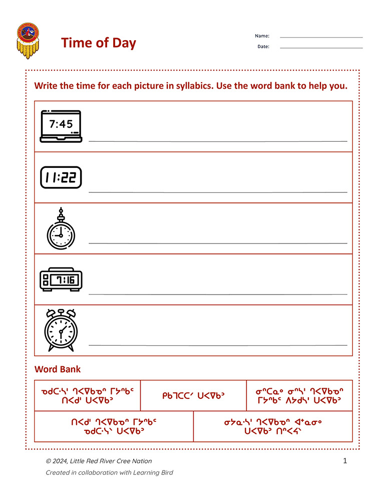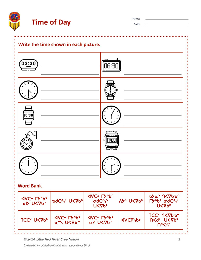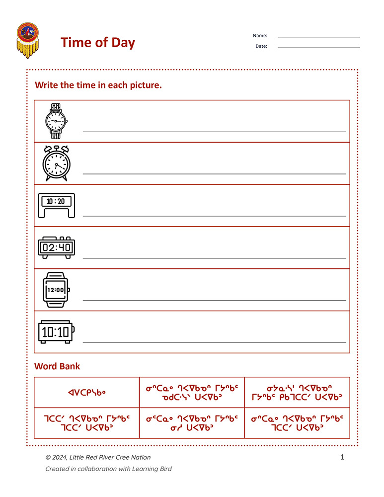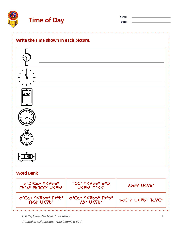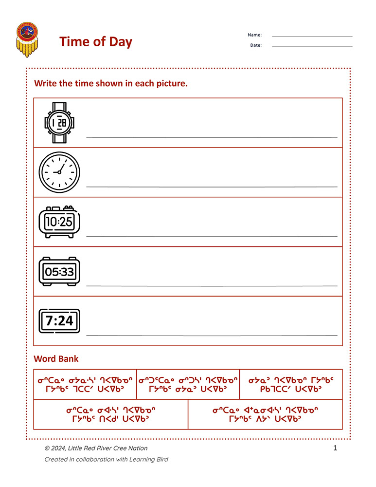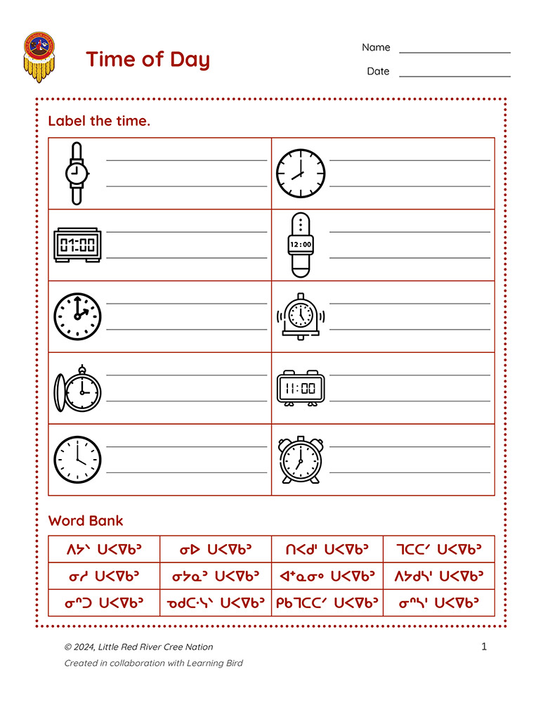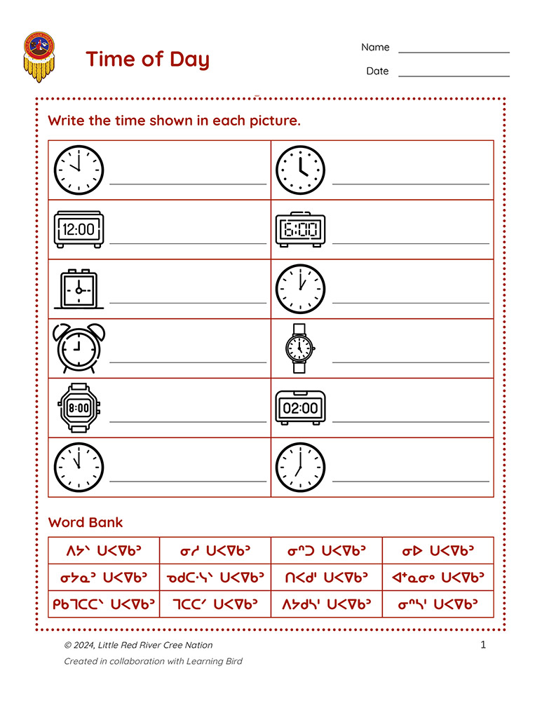 In this worksheet, Grade 12 learners practice Woodland Cree time of day vocabulary.