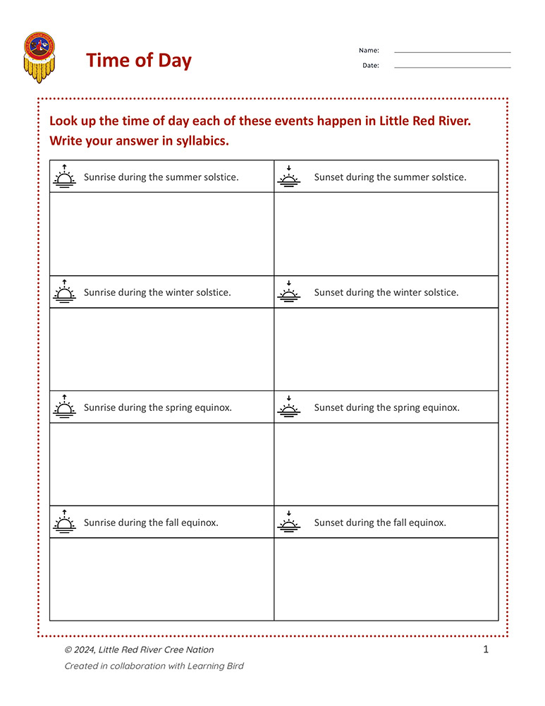 In this worksheet, Grade 4 learners practice Woodland Cree time of day vocabulary.