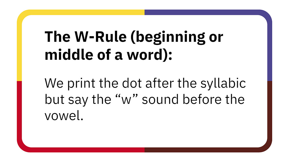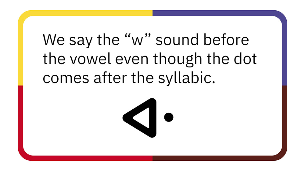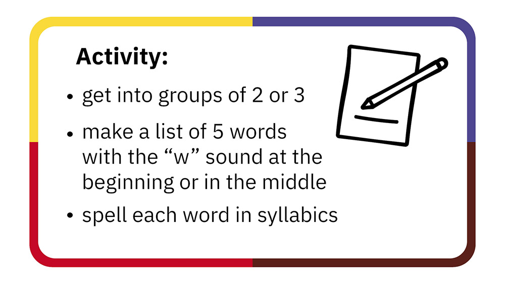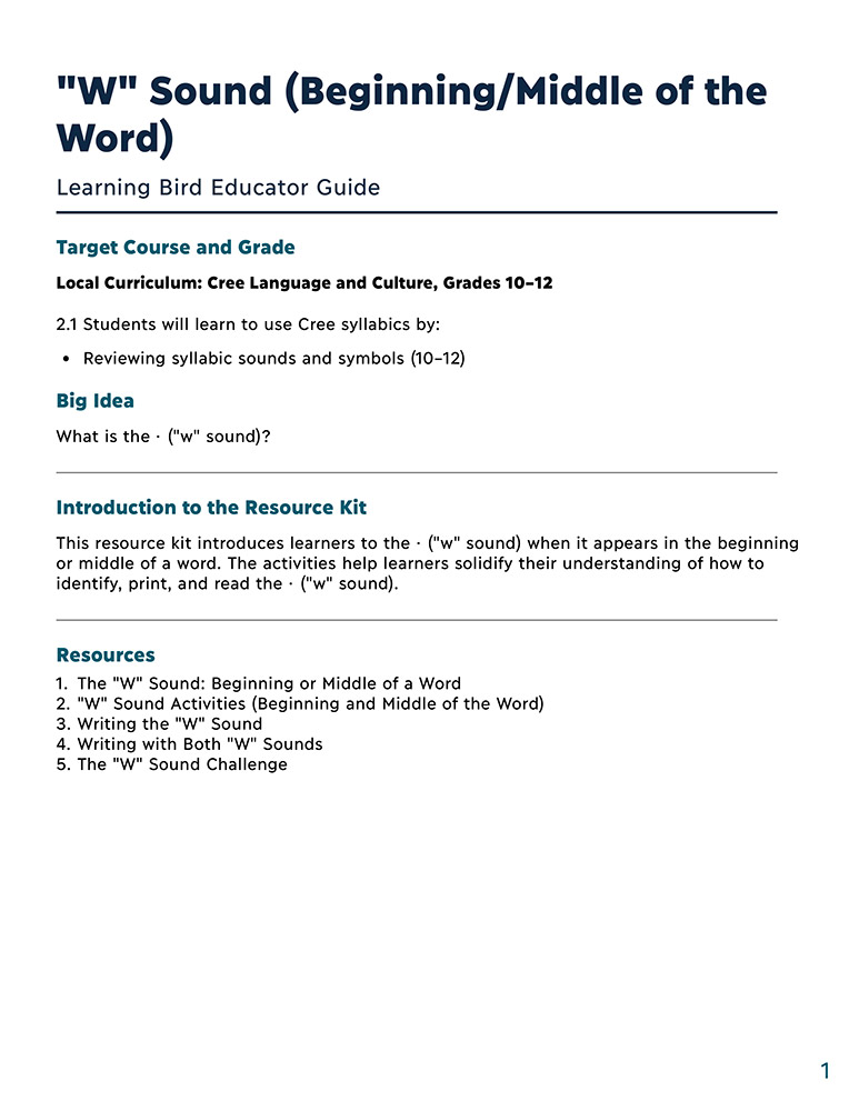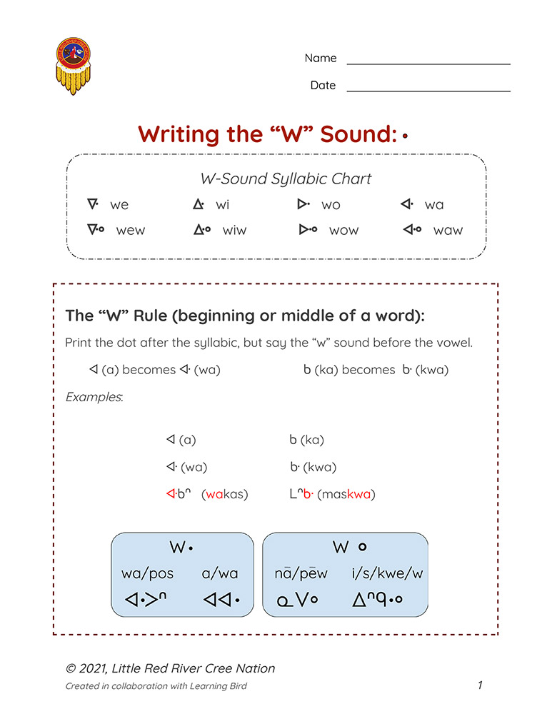 These resources introduce students to the · (“w” sound) at the beginning or in the middle of a word. Then students practice reading and printing the · (“w” sound) and translating words with the · (“w” sound) from Standard Roman Orthography and English to syllabics.