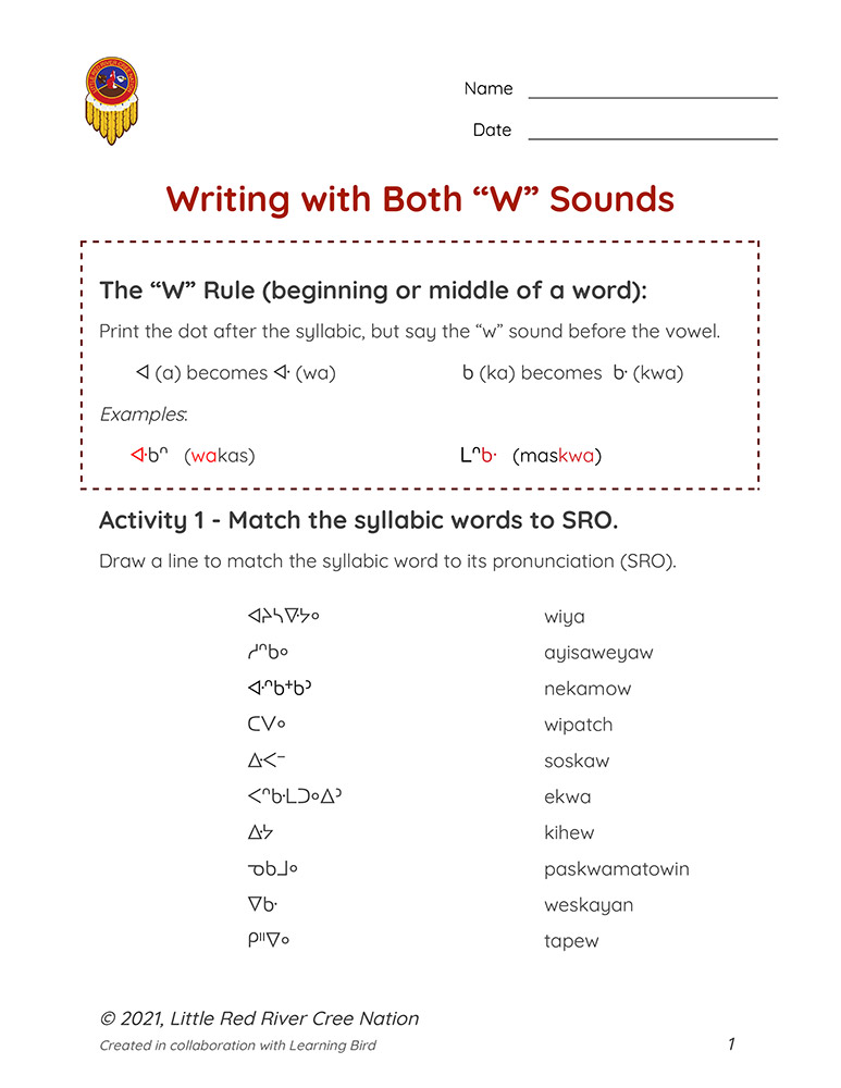 This handout includes activities for reading, identifying, and pronouncing Woodland Cree words that have the・(w-sound).