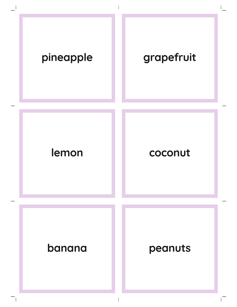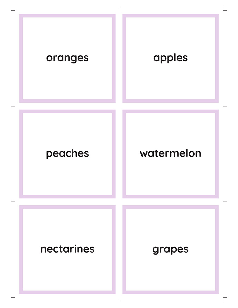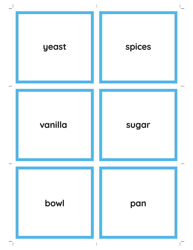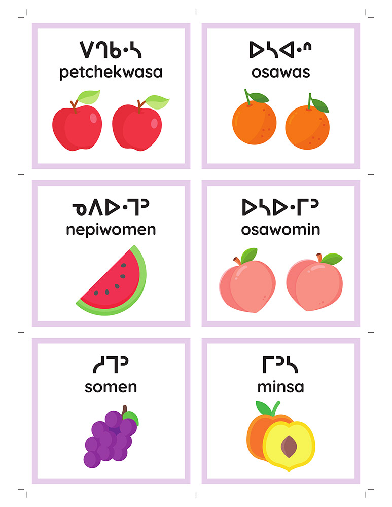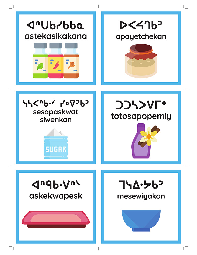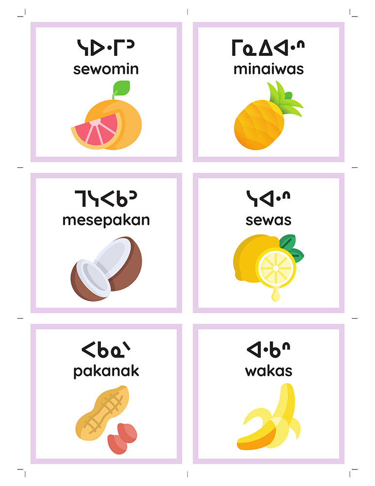These flashcards show Woodland Cree vocabulary and images on the topics of baking and fruits. They are a sample from over 300 flashcards on 29 topics from our Cree Language and Culture curriculum. Accompanying instructions for 24 self-directed games and activities help learners engage with the flashcards.